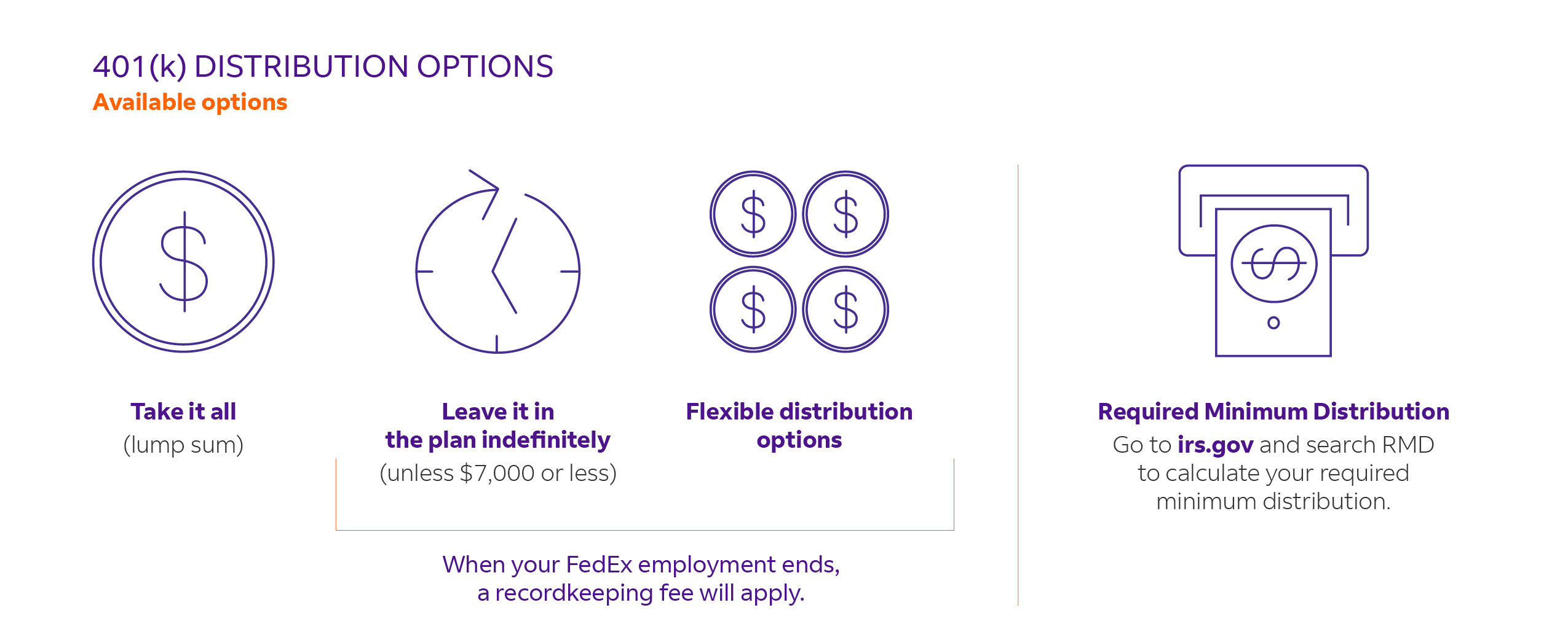 The FedEx benefits described on this website are based on a formal plan document or contract. While this information is intended to be accurate, retirement benefits are subject to the detailed provisions of the applicable plan documents. If there is a conflict between this website and the official plan documents, the plan documents always govern. You are not entitled to retirement plan benefits due to a misstatement on or an omission from this website. FedEx reserves the right to amend or terminate any benefit plan at any time and for any reason. This website content does not apply to employees of Federal Express Corporation who are classified as Residential Delivery Driver - Non-DOT effective on or after January 1, 2025